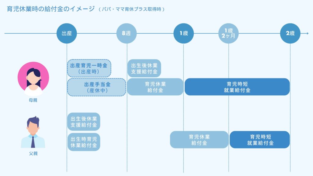 | 出生後休業支援給付金 | 母 / 父 | 子の出産直後の一定期間に、両親ともに育児休業を取得した際に上乗せされる給付金 | 給与の13% |