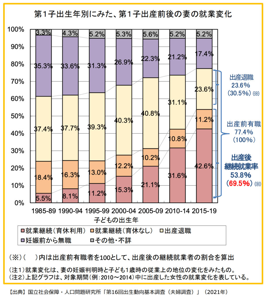 実際に第1子を出産前に仕事に就いていた女性の約3割が退職しているというデータもあります。