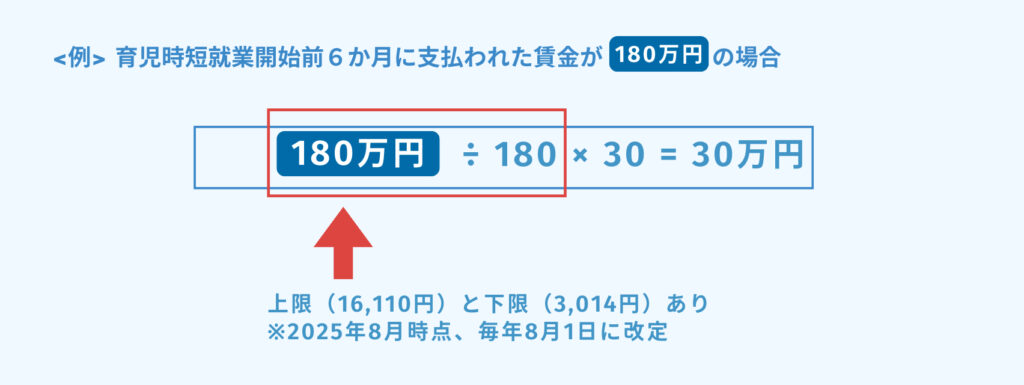 | 時短就業開始前の6ヶ月に支払われた賃金(臨時の支給や賞与などは除く)÷ 180 ×30 |
