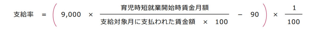 | 【賃金額が育児時短開始時の賃金額の90%超〜100%のとき】 支給対象月に支払われた賃金額 × 調整後の支給率 |