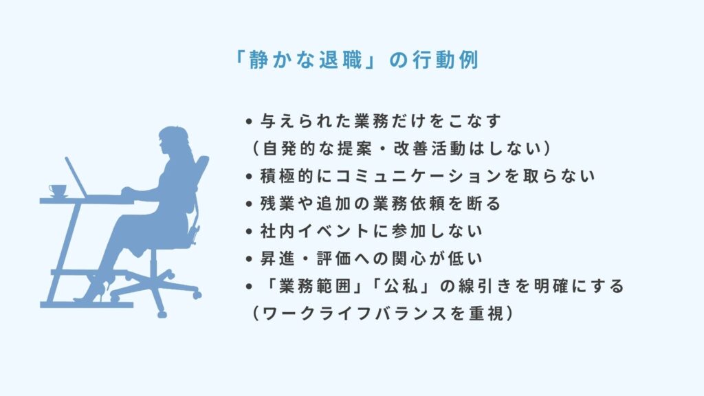 「静かな退職」を実践する従業員の具体的な行動には以下のようなものがあります。