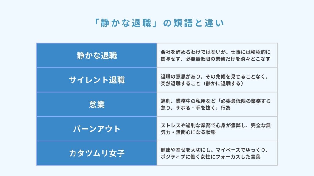 静かな退職という言葉が生まれる前にも、同様の働き方を選ぶ従業員は存在しました。静かな退職と混同されやすい働き方との違いを確認してみましょう。
