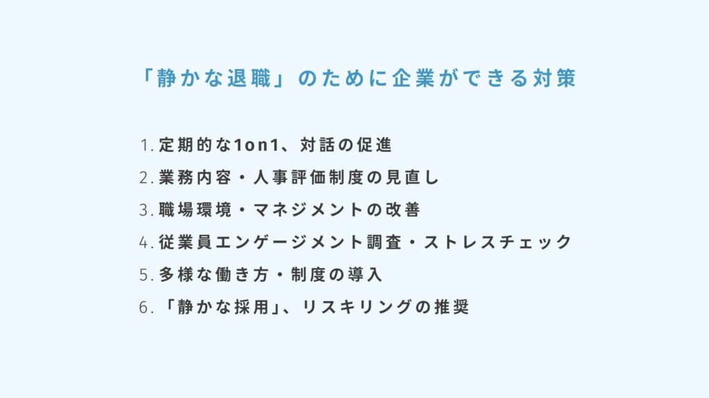 以下では静かな退職への具体的な対応策、防止策の一例を紹介します。