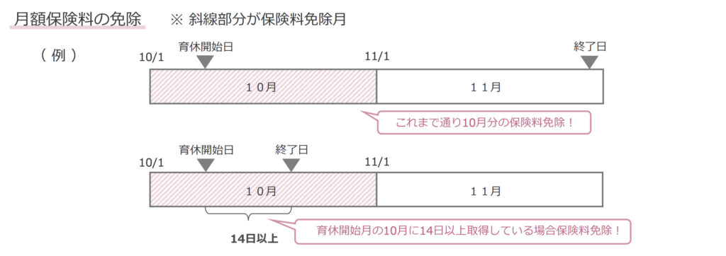 そのため2022年10月の法改正により、育休開始と終了が同じ月の場合でも、育休を14日以上取得すれば、その月の社会保険料は免除されるようになりました。