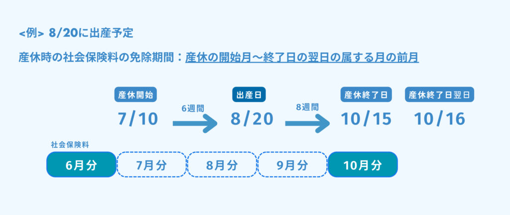 月の途中から産休に入ったときはその月から、月の途中(毎月最終日を除く)で産休を終えたときはその前月分までが免除対象です。日割りはありません。上記の例の場合、7、8、9月の社会保険が免除されます。
